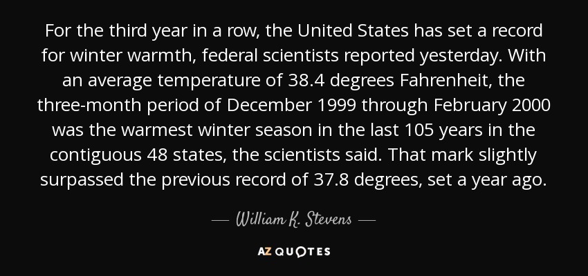 For the third year in a row, the United States has set a record for winter warmth, federal scientists reported yesterday. With an average temperature of 38.4 degrees Fahrenheit, the three-month period of December 1999 through February 2000 was the warmest winter season in the last 105 years in the contiguous 48 states, the scientists said. That mark slightly surpassed the previous record of 37.8 degrees, set a year ago.