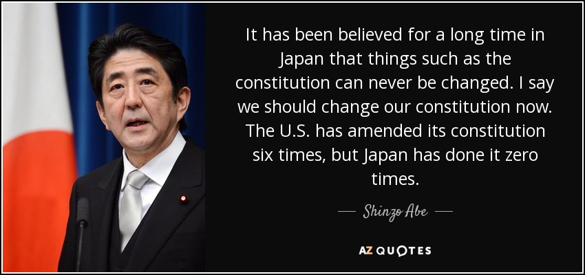 It has been believed for a long time in Japan that things such as the constitution can never be changed. I say we should change our constitution now. The U.S. has amended its constitution six times, but Japan has done it zero times.