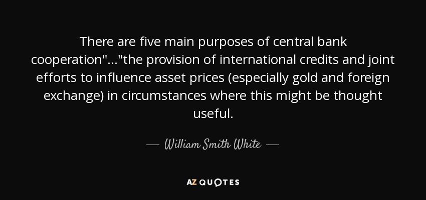 There are five main purposes of central bank cooperation"..."the provision of international credits and joint efforts to influence asset prices (especially gold and foreign exchange) in circumstances where this might be thought useful.