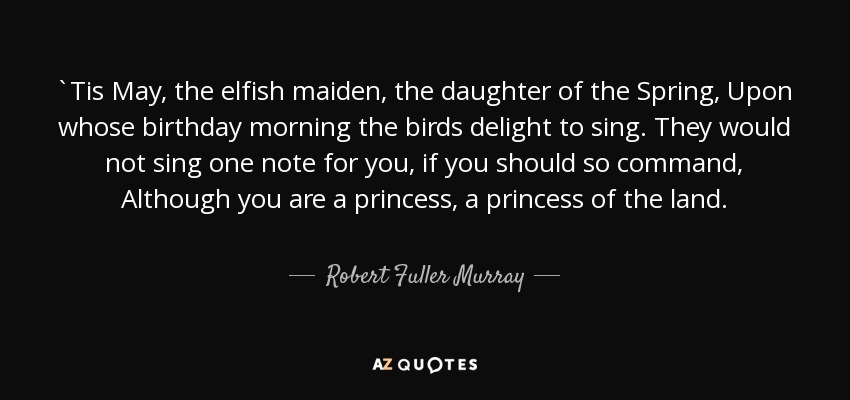 `Tis May, the elfish maiden, the daughter of the Spring, Upon whose birthday morning the birds delight to sing. They would not sing one note for you, if you should so command, Although you are a princess, a princess of the land.