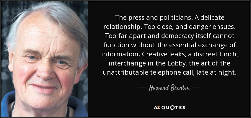 The press and politicians. A delicate relationship. Too close, and danger ensues. Too far apart and democracy itself cannot function without the essential exchange of information. Creative leaks, a discreet lunch, interchange in the Lobby, the art of the unattributable telephone call, late at night.
