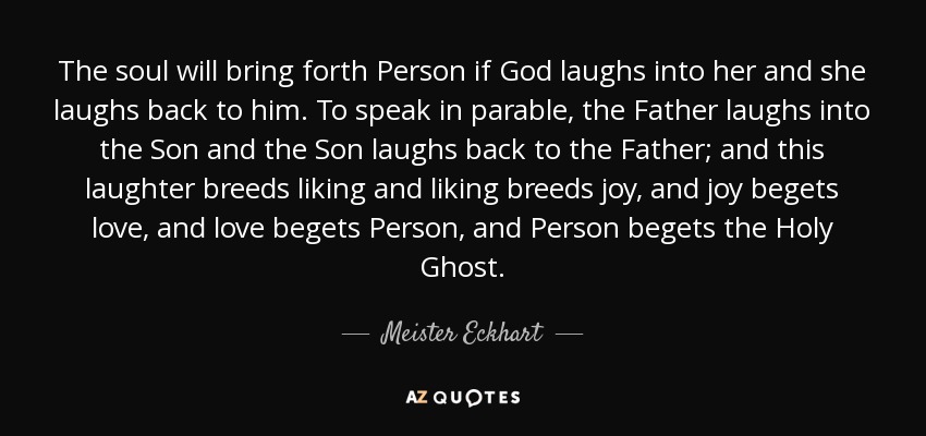The soul will bring forth Person if God laughs into her and she laughs back to him. To speak in parable, the Father laughs into the Son and the Son laughs back to the Father; and this laughter breeds liking and liking breeds joy, and joy begets love, and love begets Person, and Person begets the Holy Ghost.