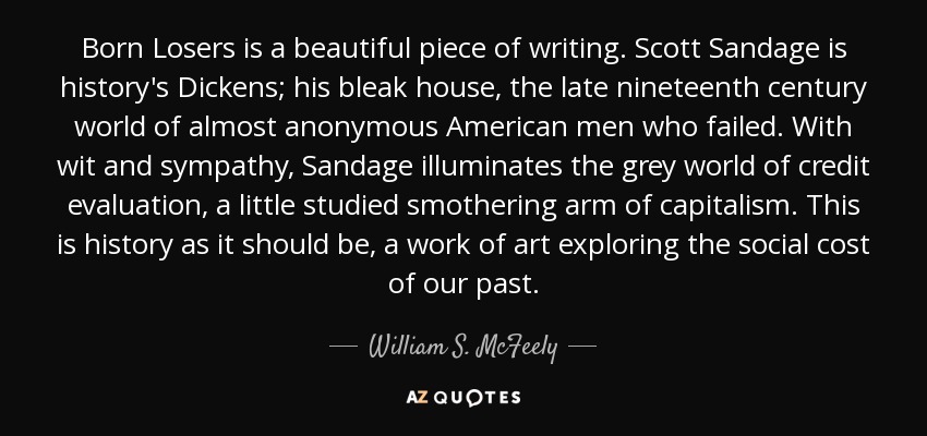 Born Losers is a beautiful piece of writing. Scott Sandage is history's Dickens; his bleak house, the late nineteenth century world of almost anonymous American men who failed. With wit and sympathy, Sandage illuminates the grey world of credit evaluation, a little studied smothering arm of capitalism. This is history as it should be, a work of art exploring the social cost of our past.