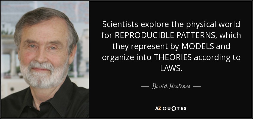 Scientists explore the physical world for REPRODUCIBLE PATTERNS, which they represent by MODELS and organize into THEORIES according to LAWS.