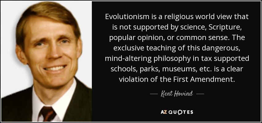 Evolutionism is a religious world view that is not supported by science, Scripture, popular opinion, or common sense. The exclusive teaching of this dangerous, mind-altering philosophy in tax supported schools, parks, museums, etc. is a clear violation of the First Amendment.