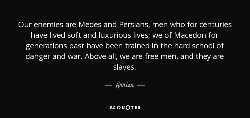 Our enemies are Medes and Persians, men who for centuries have lived soft and luxurious lives; we of Macedon for generations past have been trained in the hard school of danger and war. Above all, we are free men, and they are slaves.