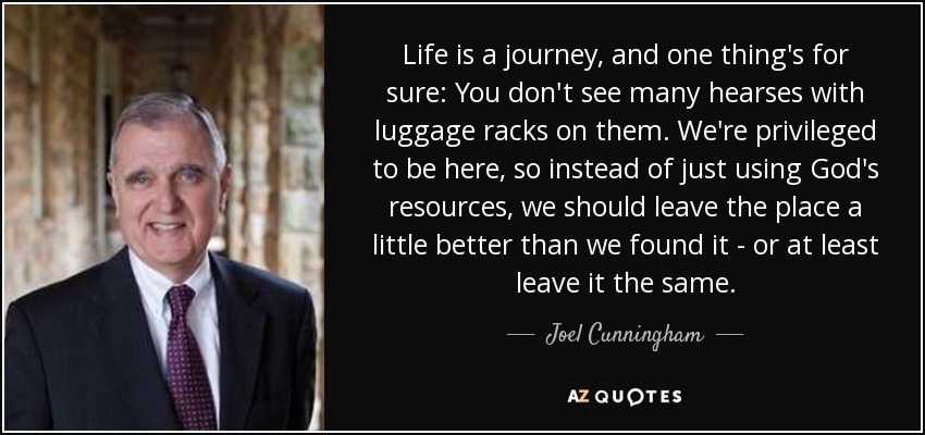 Life is a journey, and one thing's for sure: You don't see many hearses with luggage racks on them. We're privileged to be here, so instead of just using God's resources, we should leave the place a little better than we found it - or at least leave it the same.