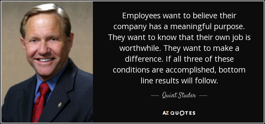 Employees want to believe their company has a meaningful purpose. They want to know that their own job is worthwhile. They want to make a difference. If all three of these conditions are accomplished, bottom line results will follow.