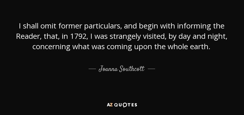 Joanna Southcott (1810). “The prophecies of Joanna Southcott, relating to the dreadful judgments that will fall on this nation in the present year, 1810. Selected and animadverted on by R. Hann”, p.11