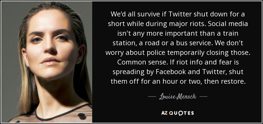 We'd all survive if Twitter shut down for a short while during major riots. Social media isn't any more important than a train station, a road or a bus service. We don't worry about police temporarily closing those. Common sense. If riot info and fear is spreading by Facebook and Twitter, shut them off for an hour or two, then restore.