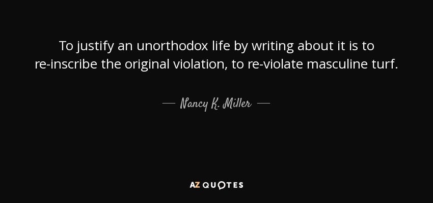 To justify an unorthodox life by writing about it is to re-inscribe the original violation, to re-violate masculine turf.