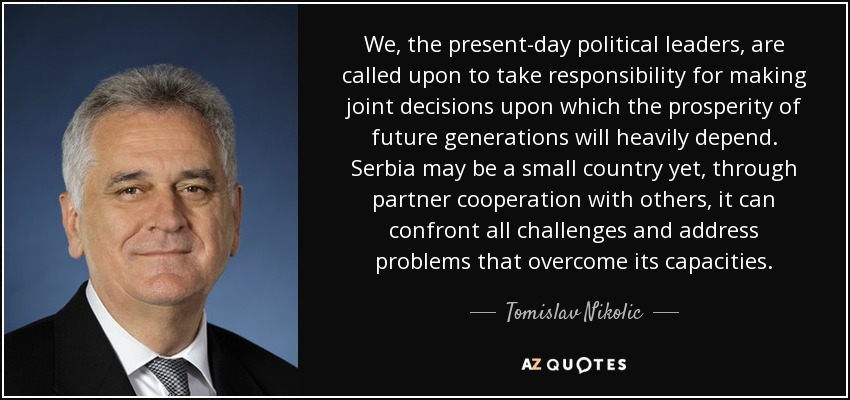 We, the present-day political leaders, are called upon to take responsibility for making joint decisions upon which the prosperity of future generations will heavily depend. Serbia may be a small country yet, through partner cooperation with others, it can confront all challenges and address problems that overcome its capacities.
