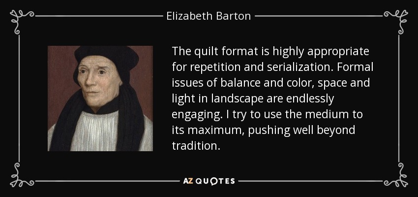 The quilt format is highly appropriate for repetition and serialization. Formal issues of balance and color, space and light in landscape are endlessly engaging. I try to use the medium to its maximum, pushing well beyond tradition.
