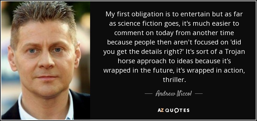 My first obligation is to entertain but as far as science fiction goes, it's much easier to comment on today from another time because people then aren't focused on 'did you get the details right?' It's sort of a Trojan horse approach to ideas because it's wrapped in the future, it's wrapped in action, thriller.