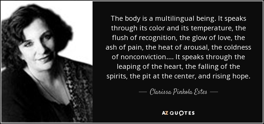The body is a multilingual being. It speaks through its color and its temperature, the flush of recognition, the glow of love, the ash of pain, the heat of arousal, the coldness of nonconviction. . . . It speaks through the leaping of the heart, the falling of the spirits, the pit at the center, and rising hope.