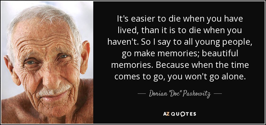 It's easier to die when you have lived, than it is to die when you haven't. So I say to all young people, go make memories; beautiful memories. Because when the time comes to go, you won't go alone.