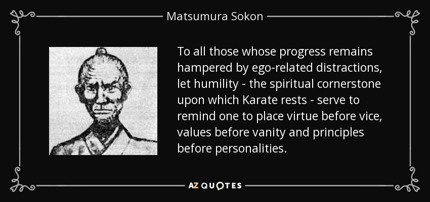 To all those whose progress remains hampered by ego-related distractions, let humility - the spiritual cornerstone upon which Karate rests - serve to remind one to place virtue before vice, values before vanity and principles before personalities.