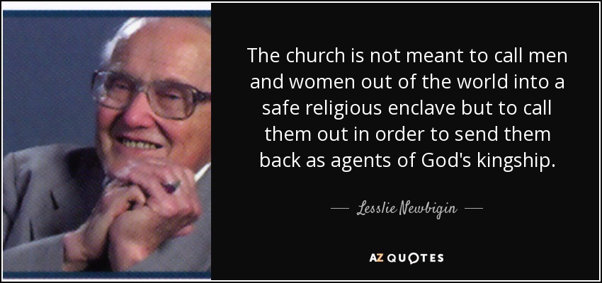 The church is not meant to call men and women out of the world into a safe religious enclave but to call them out in order to send them back as agents of God's kingship.