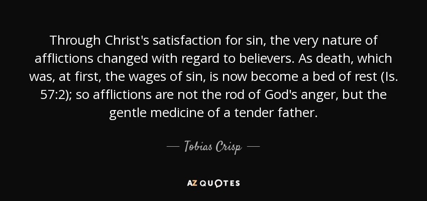 Through Christ's satisfaction for sin, the very nature of afflictions changed with regard to believers. As death, which was, at first, the wages of sin, is now become a bed of rest (Is. 57:2); so afflictions are not the rod of God's anger, but the gentle medicine of a tender father.