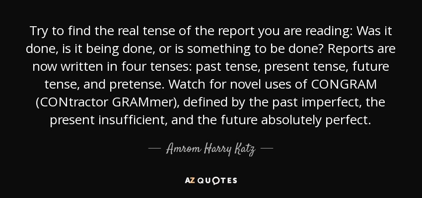 Try to find the real tense of the report you are reading: Was it done, is it being done, or is something to be done? Reports are now written in four tenses: past tense, present tense, future tense, and pretense. Watch for novel uses of CONGRAM (CONtractor GRAMmer), defined by the past imperfect, the present insufficient, and the future absolutely perfect.