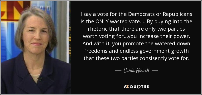I say a vote for the Democrats or Republicans is the ONLY wasted vote.... By buying into the rhetoric that there are only two parties worth voting for...you increase their power. And with it, you promote the watered-down freedoms and endless government growth that these two parties consisently vote for.