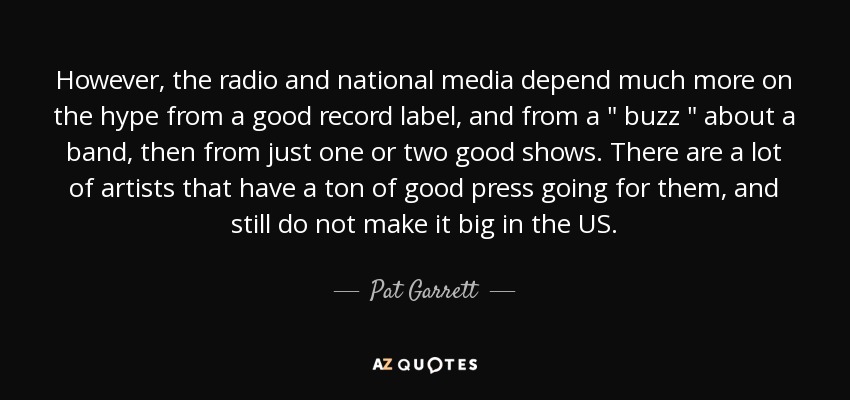 However, the radio and national media depend much more on the hype from a good record label, and from a " buzz " about a band, then from just one or two good shows. There are a lot of artists that have a ton of good press going for them, and still do not make it big in the US.