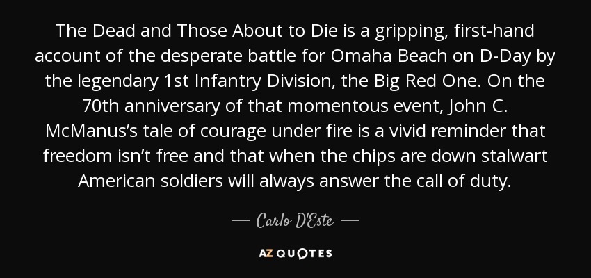 The Dead and Those About to Die is a gripping, first-hand account of the desperate battle for Omaha Beach on D-Day by the legendary 1st Infantry Division, the Big Red One. On the 70th anniversary of that momentous event, John C. McManus’s tale of courage under fire is a vivid reminder that freedom isn’t free and that when the chips are down stalwart American soldiers will always answer the call of duty.