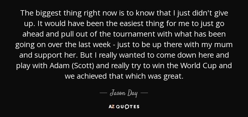 The biggest thing right now is to know that I just didn't give up. It would have been the easiest thing for me to just go ahead and pull out of the tournament with what has been going on over the last week - just to be up there with my mum and support her. But I really wanted to come down here and play with Adam (Scott) and really try to win the World Cup and we achieved that which was great.