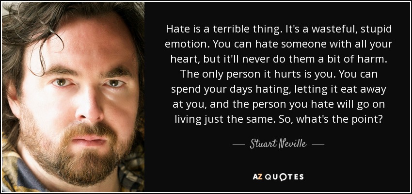 Hate is a terrible thing. It's a wasteful, stupid emotion. You can hate someone with all your heart, but it'll never do them a bit of harm. The only person it hurts is you. You can spend your days hating, letting it eat away at you, and the person you hate will go on living just the same. So, what's the point?