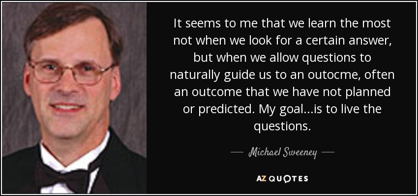 It seems to me that we learn the most not when we look for a certain answer, but when we allow questions to naturally guide us to an outocme, often an outcome that we have not planned or predicted. My goal...is to live the questions.