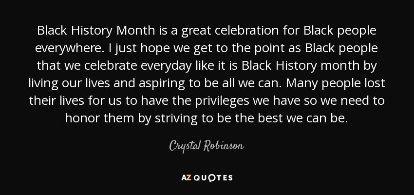 Black History Month is a great celebration for Black people everywhere. I just hope we get to the point as Black people that we celebrate everyday like it is Black History month by living our lives and aspiring to be all we can. Many people lost their lives for us to have the privileges we have so we need to honor them by striving to be the best we can be.