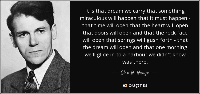 It is that dream we carry that something miraculous will happen that it must happen - that time will open that the heart will open that doors will open and that the rock face will open that springs will gush forth - that the dream will open and that one morning we'll glide in to a harbour we didn't know was there.