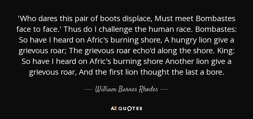'Who dares this pair of boots displace, Must meet Bombastes face to face.' Thus do I challenge the human race. Bombastes: So have I heard on Afric's burning shore, A hungry lion give a grievous roar; The grievous roar echo'd along the shore. King: So have I heard on Afric's burning shore Another lion give a grievous roar, And the first lion thought the last a bore.