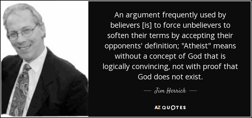 An argument frequently used by believers [is] to force unbelievers to soften their terms by accepting their opponents' definition; "Atheist" means without a concept of God that is logically convincing, not with proof that God does not exist.