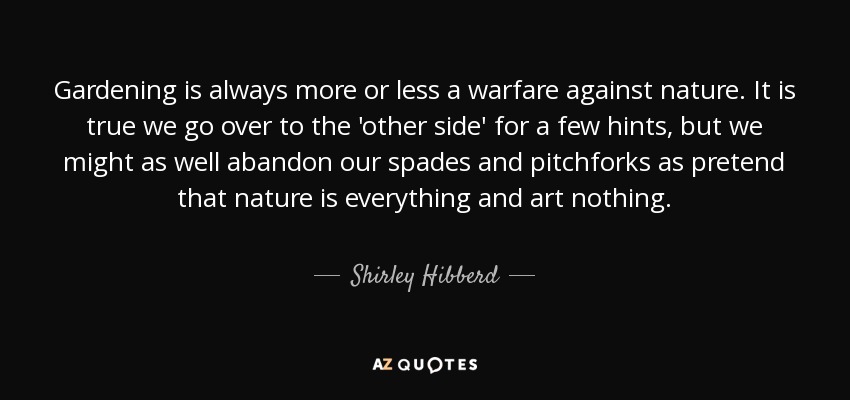 Gardening is always more or less a warfare against nature. It is true we go over to the 'other side' for a few hints, but we might as well abandon our spades and pitchforks as pretend that nature is everything and art nothing.