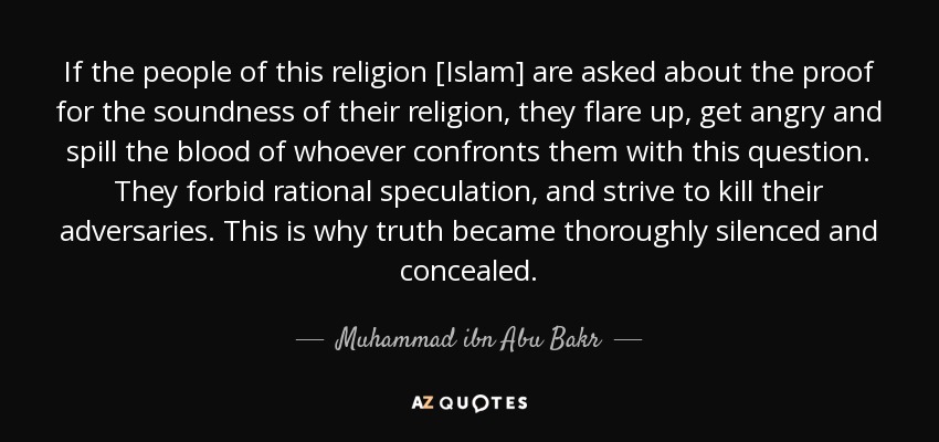 If the people of this religion [Islam] are asked about the proof for the soundness of their religion, they flare up, get angry and spill the blood of whoever confronts them with this question. They forbid rational speculation, and strive to kill their adversaries. This is why truth became thoroughly silenced and concealed.