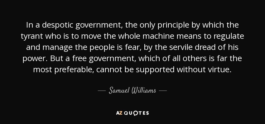 In a despotic government, the only principle by which the tyrant who is to move the whole machine means to regulate and manage the people is fear, by the servile dread of his power. But a free government, which of all others is far the most preferable, cannot be supported without virtue.