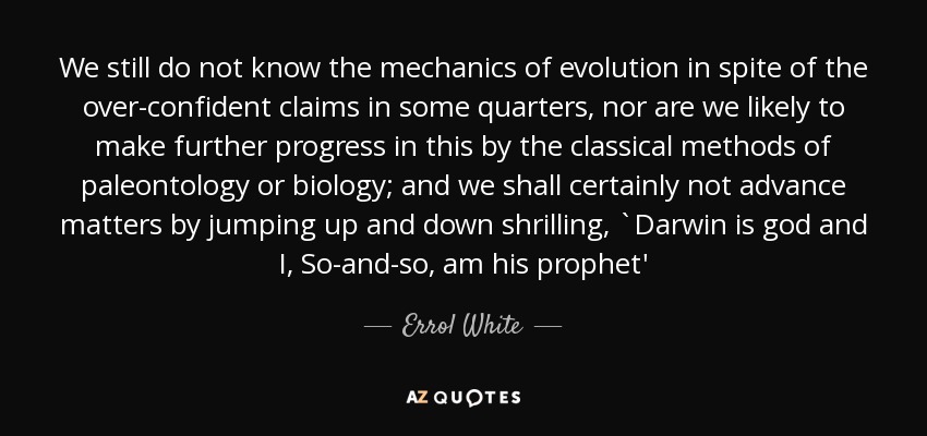 We still do not know the mechanics of evolution in spite of the over-confident claims in some quarters, nor are we likely to make further progress in this by the classical methods of paleontology or biology; and we shall certainly not advance matters by jumping up and down shrilling, `Darwin is god and I, So-and-so, am his prophet'