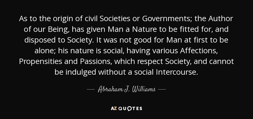 As to the origin of civil Societies or Governments; the Author of our Being, has given Man a Nature to be fitted for, and disposed to Society. It was not good for Man at first to be alone; his nature is social, having various Affections, Propensities and Passions, which respect Society, and cannot be indulged without a social Intercourse.