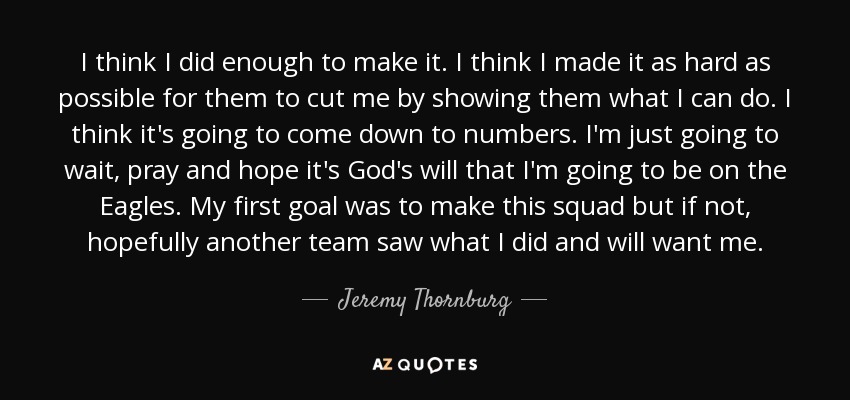 I think I did enough to make it. I think I made it as hard as possible for them to cut me by showing them what I can do. I think it's going to come down to numbers. I'm just going to wait, pray and hope it's God's will that I'm going to be on the Eagles. My first goal was to make this squad but if not, hopefully another team saw what I did and will want me.