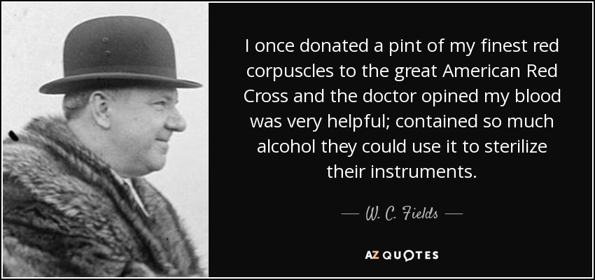 I once donated a pint of my finest red corpuscles to the great American Red Cross and the doctor opined my blood was very helpful; contained so much alcohol they could use it to sterilize their instruments.