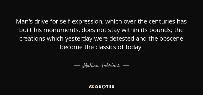 Man's drive for self-expression, which over the centuries has built his monuments, does not stay within its bounds; the creations which yesterday were detested and the obscene become the classics of today.