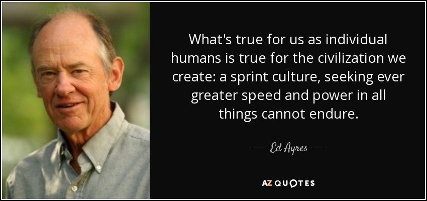 What's true for us as individual humans is true for the civilization we create: a sprint culture, seeking ever greater speed and power in all things cannot endure.
