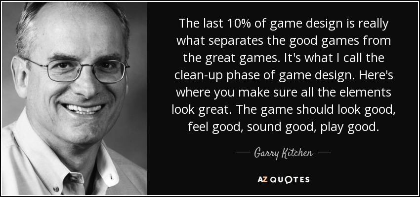 The last 10% of game design is really what separates the good games from the great games. It's what I call the clean-up phase of game design. Here's where you make sure all the elements look great. The game should look good, feel good, sound good, play good.