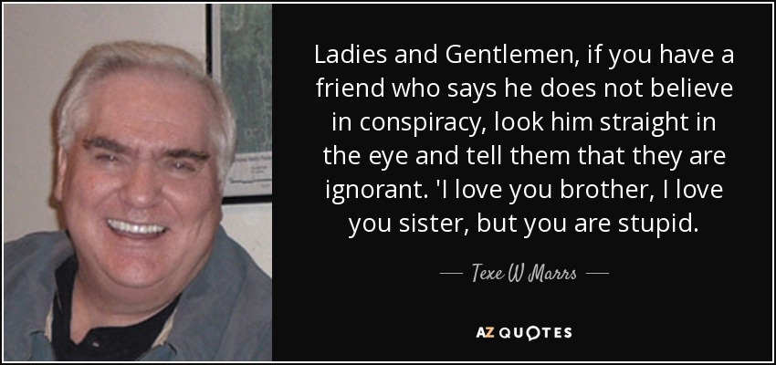 Ladies and Gentlemen, if you have a friend who says he does not believe in conspiracy, look him straight in the eye and tell them that they are ignorant. 'I love you brother, I love you sister, but you are stupid.