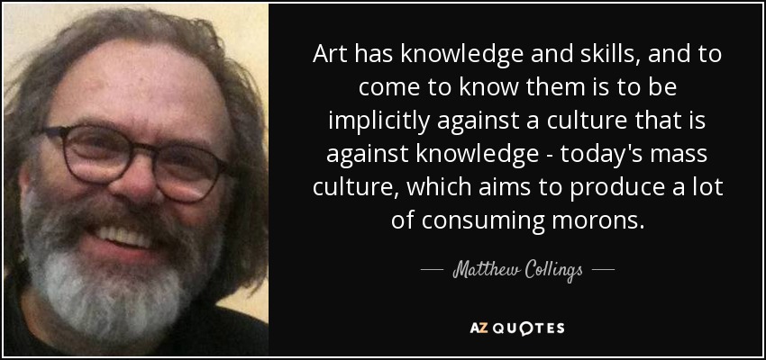 Art has knowledge and skills, and to come to know them is to be implicitly against a culture that is against knowledge - today's mass culture, which aims to produce a lot of consuming morons.