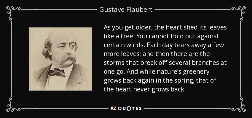 As you get older, the heart shed its leaves like a tree. You cannot hold out against certain winds. Each day tears away a few more leaves; and then there are the storms that break off several branches at one go. And while nature’s greenery grows back again in the spring, that of the heart never grows back.