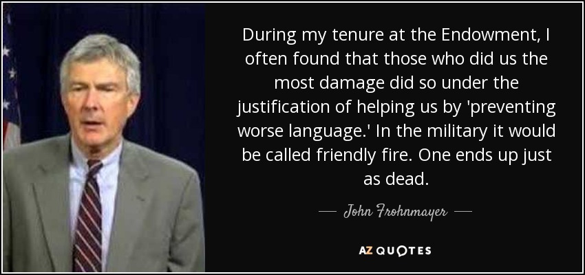 During my tenure at the Endowment, I often found that those who did us the most damage did so under the justification of helping us by 'preventing worse language.' In the military it would be called friendly fire. One ends up just as dead.