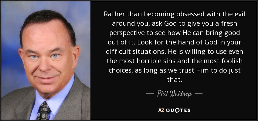 Rather than becoming obsessed with the evil around you, ask God to give you a fresh perspective to see how He can bring good out of it. Look for the hand of God in your difficult situations. He is willing to use even the most horrible sins and the most foolish choices, as long as we trust Him to do just that.