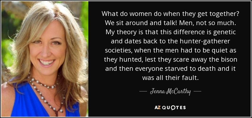 What do women do when they get together? We sit around and talk! Men, not so much. My theory is that this difference is genetic and dates back to the hunter-gatherer societies, when the men had to be quiet as they hunted, lest they scare away the bison and then everyone starved to death and it was all their fault.